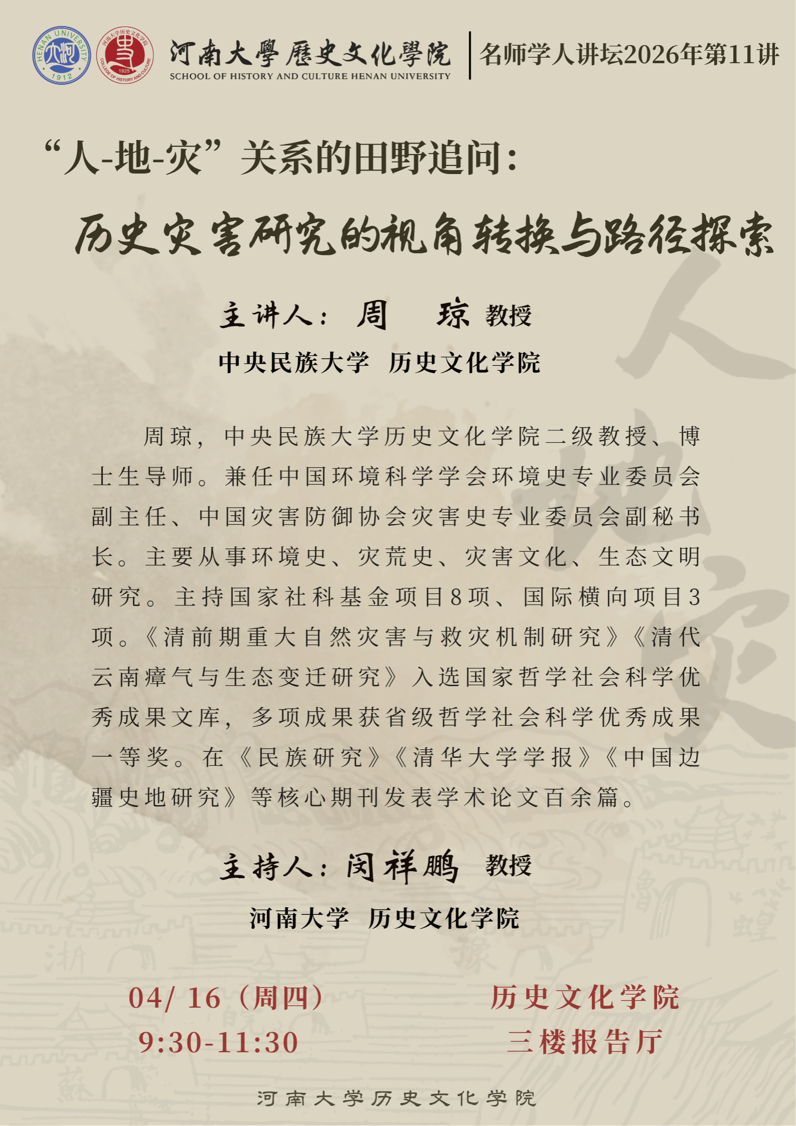 【讲座预告】周琼:“人-地-灾”关系的田野追问: 历史灾害研究的视角转换与路径探索