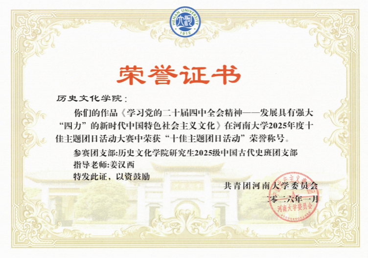 近日,河南大学2025年度“十佳主题团日活动”大赛落下帷幕。经过激烈角逐,我院研究生2025级中国古代史班团支部以“学习党的二十届四中全会精神——发展具有强大‘四力’的新时代中国特色社会主义文化”为主题的团日活动,理念先进,形式新颖,主题鲜明,成功入选河南大学“十佳主题团日活动”。