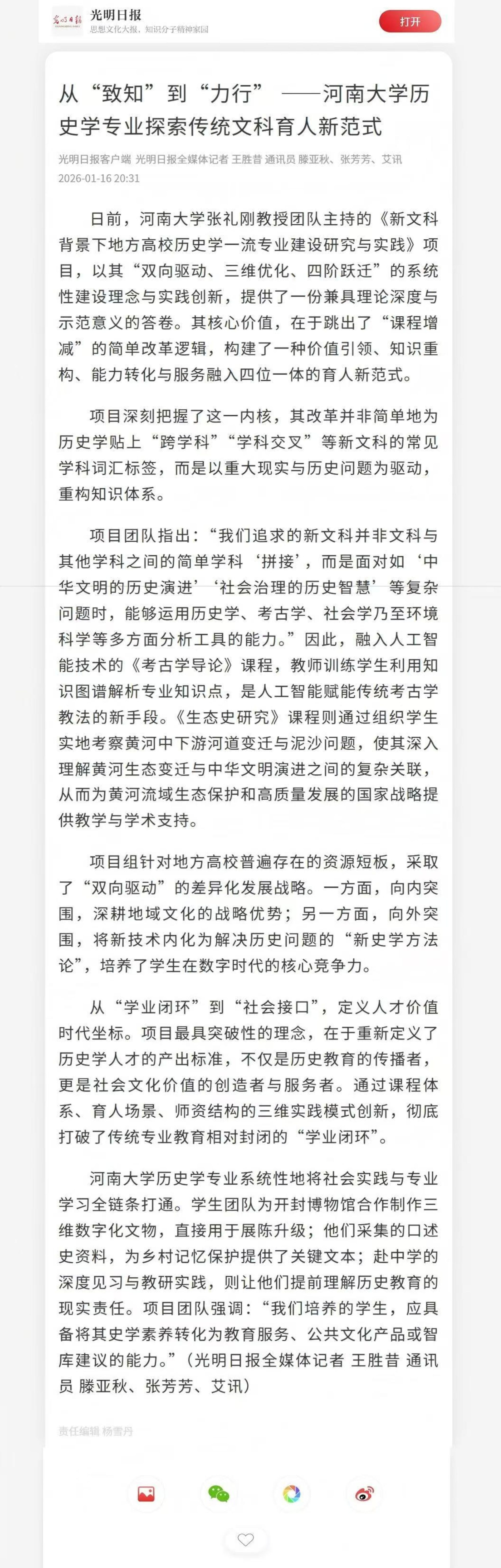 深耕学理以承古今,对接时代而育英才。《光明日报》于2026年1月16日发表以《从“致知”到“力行” ——河南大学历史学专业探索传统文科育人新范式》为题的文章,报道我院学科建设与人才培养情况。全文如下: