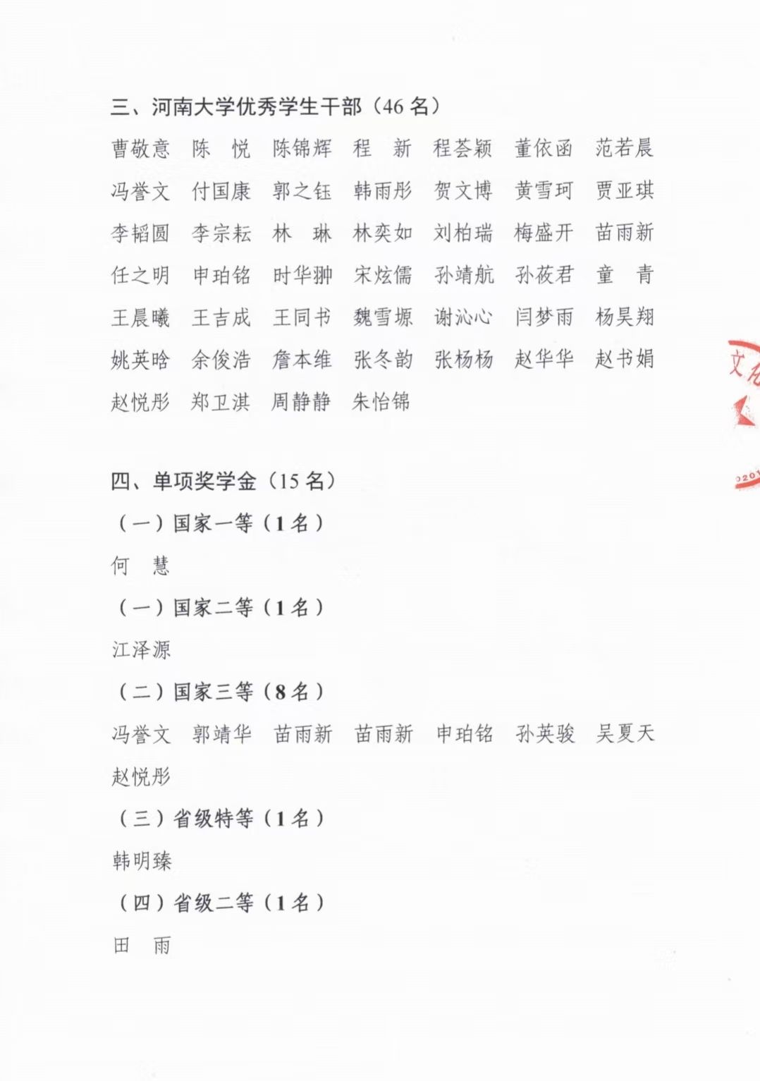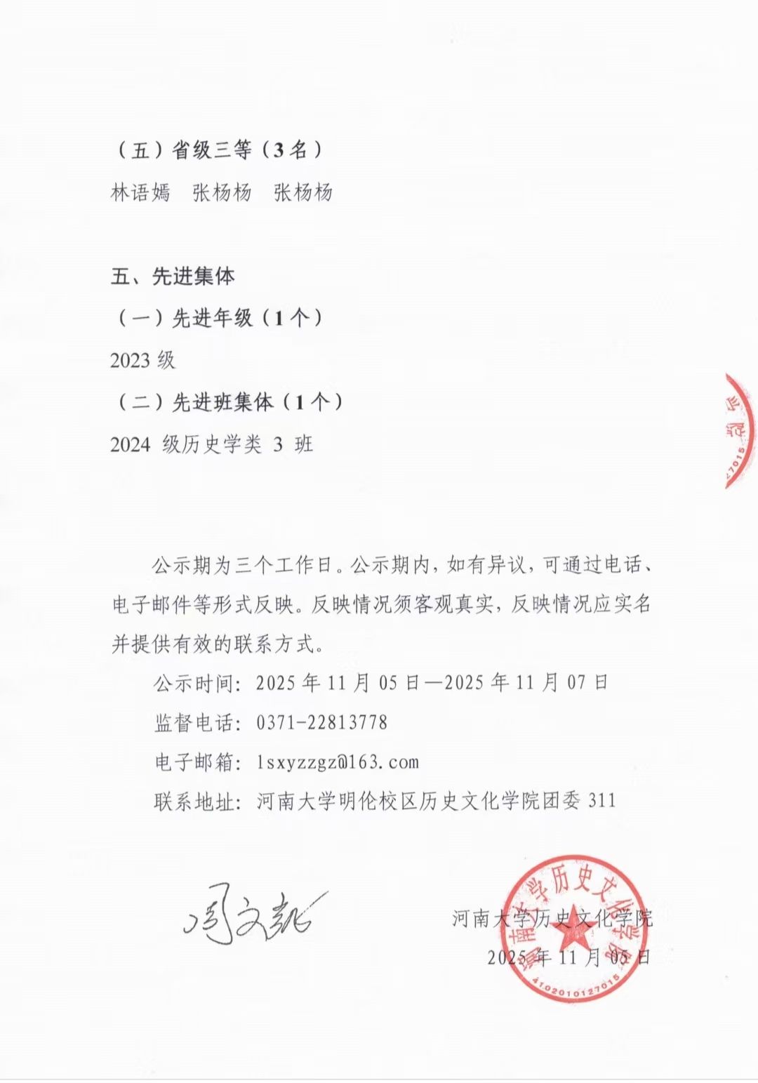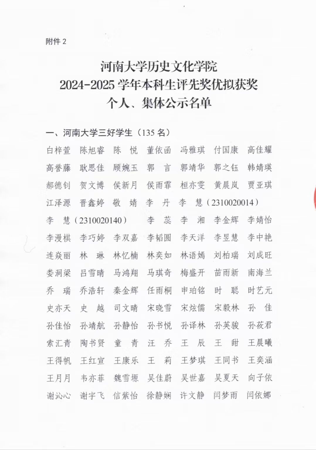河南大学历史文化学院2024-2025学年本科生评先奖优拟获奖个人、集体公示名单