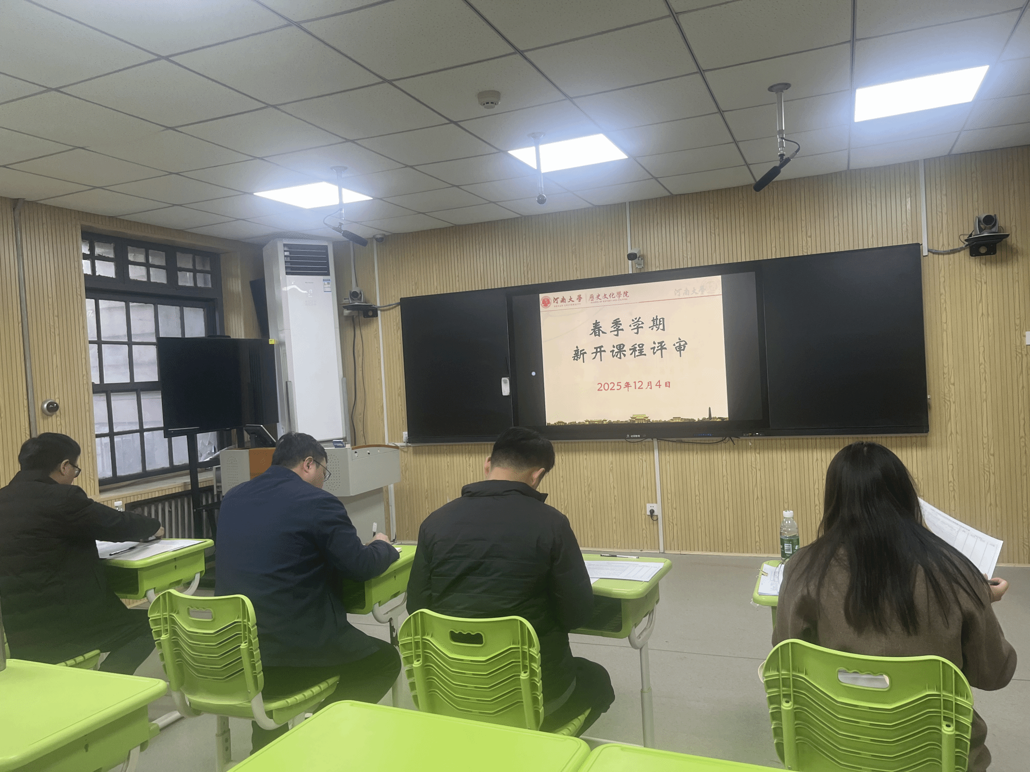 2025年12月4日下午,河南大学历史文化学院在107教室举办新开课程试讲评审会。本次评审会旨在进一步提升本科教学质量,优化课程体系,确保新开课程的科学性与教学实效。学院特邀周文凯、王博凯、谢佳芮、贺怀锴四位老师组成评审专家组,对熊钿、张玉翠、崔庆贺、孟兆鑫四位青年教师申请开设的课程进行现场评议。