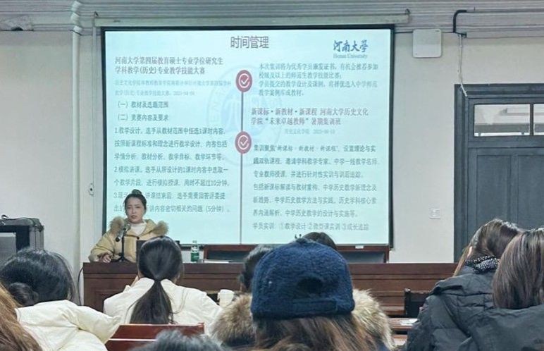 针对教学技能提升,李梦茹结合河南大学第四届教育硕士教学技能大赛的参赛经历分享实战经验。她首先详细解读了比赛的三大核心环节及评价标准:模拟讲课涵盖教学目标、内容、方法等评价维度,现场答辩侧重思维品质与综合素质,教学设计强调规范与创新,让同学们清晰把握竞赛核心导向。一定要重视对于本项比赛的前期准备,争取在比赛中斩获佳绩。