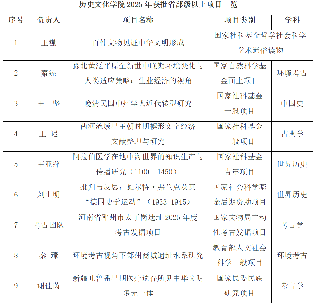 2025年,历史文化学院在项目申报中成果丰硕,获批各类国家级课题17项,其中国家社科基金和自然基金项目6项,含首次获批国家社科基金哲学社会科学学术通俗读物项目、首次获批国家自然科学基金项目,以及古典学领域首个国家社科基金一般项目;同时获批国家文物局主动性考古发掘项目1项、教育部人文社会科学一般项目1项、国家民委民族研究项目1项;国家博士后项目7项,包括中国博士后基金特别资助1项、面上资助4项,国家资助博士后研究人员计划B档1项、C档1项;全国考古人才振兴计划项目创新团队子课题1项。此外,获批河南省社科基金项目6项(一般项目1项、青年项目1项、文化研究专项4项),河南省科技考古提升专项2项。2025年累计获批省部级以上项目25项。