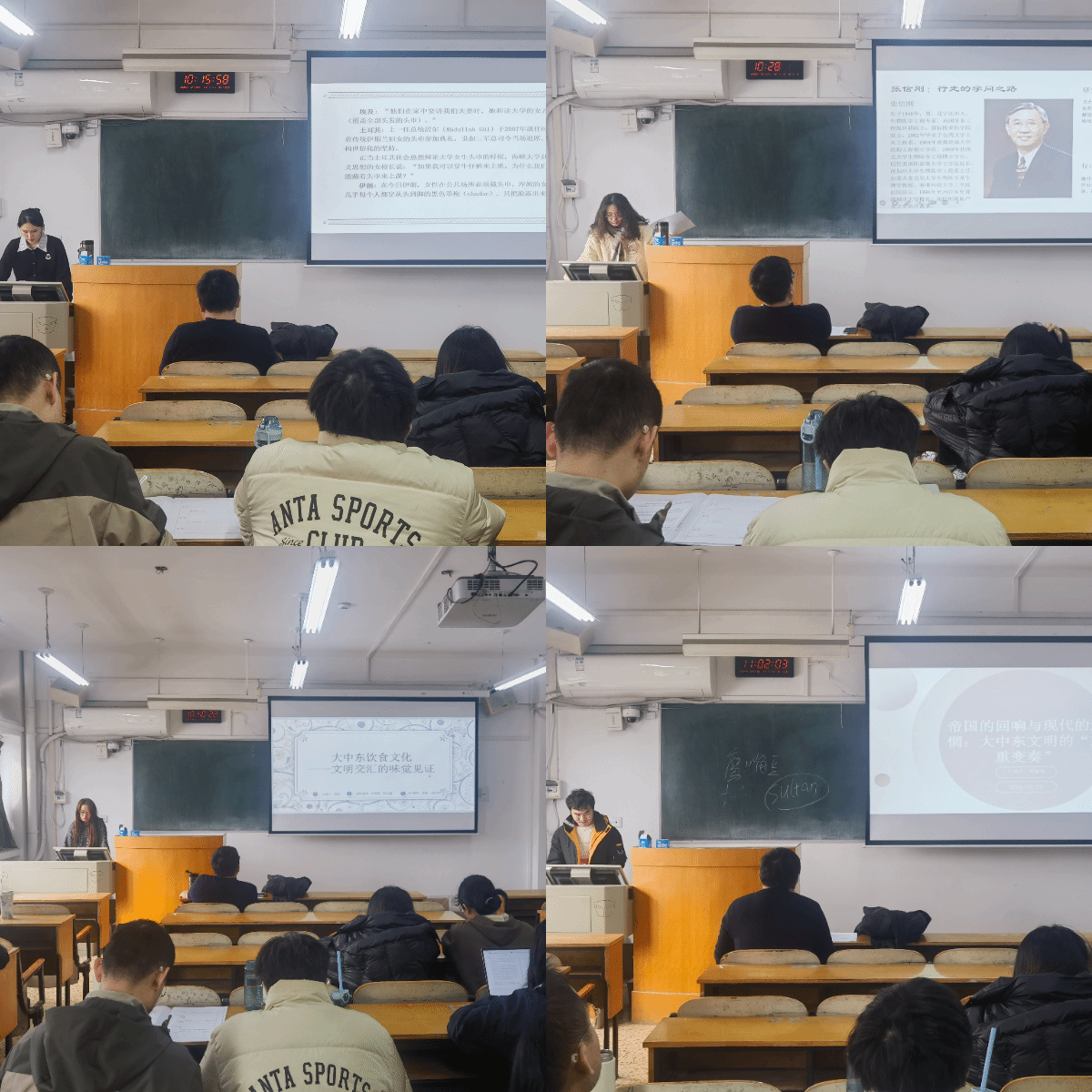在随后的分组汇报环节中,四组同学分别从不同视角展开讨论。第一组由孙静怡同学发言,围绕中东女性头巾的政治象征与女性主体视角等层面,讨论了头巾在不同语境中的多重含义。刘洪洁以伊朗与土耳其为例,进一步指出该问题所折射出的宗教与世俗权力张力,强调应避免以单一价值标准评判。