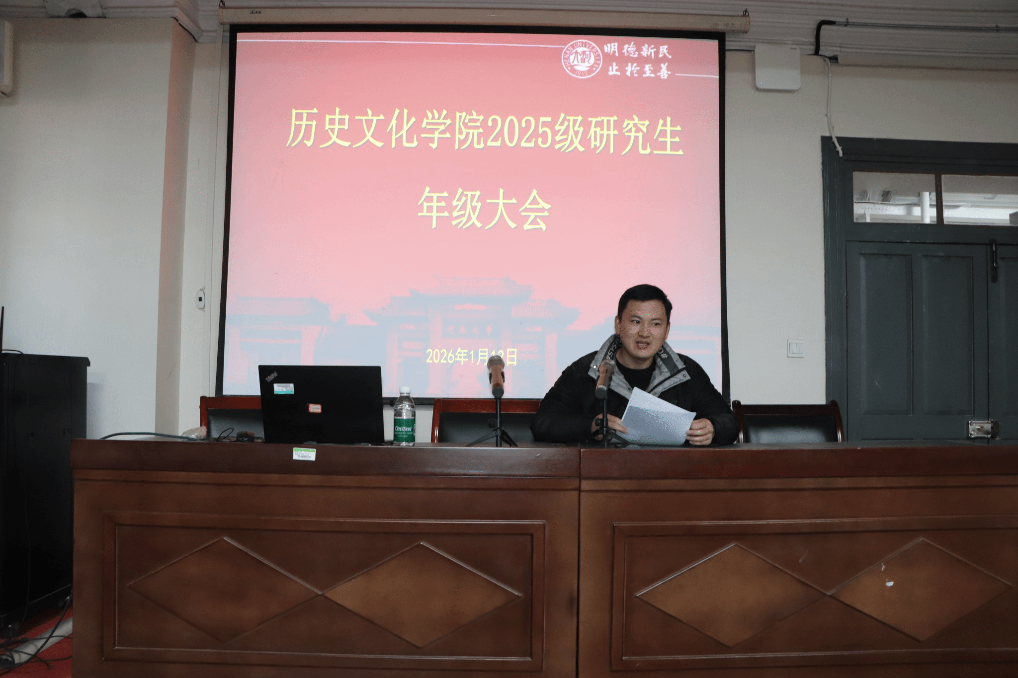 临近期末,寒假将至。2026年1月12日,历史文化学院2025级研究生于111教室召开年级,旨在为本学期的研究生工作画上圆满句号,并为同学们的寒假生活保驾护航。大会围绕学期工作总结、寒假安全教育、学业规划指导及心理健康教育等议题展开,研究生辅导员姜汉西为同学们上了一堂详尽的学期总结与安全教育课。